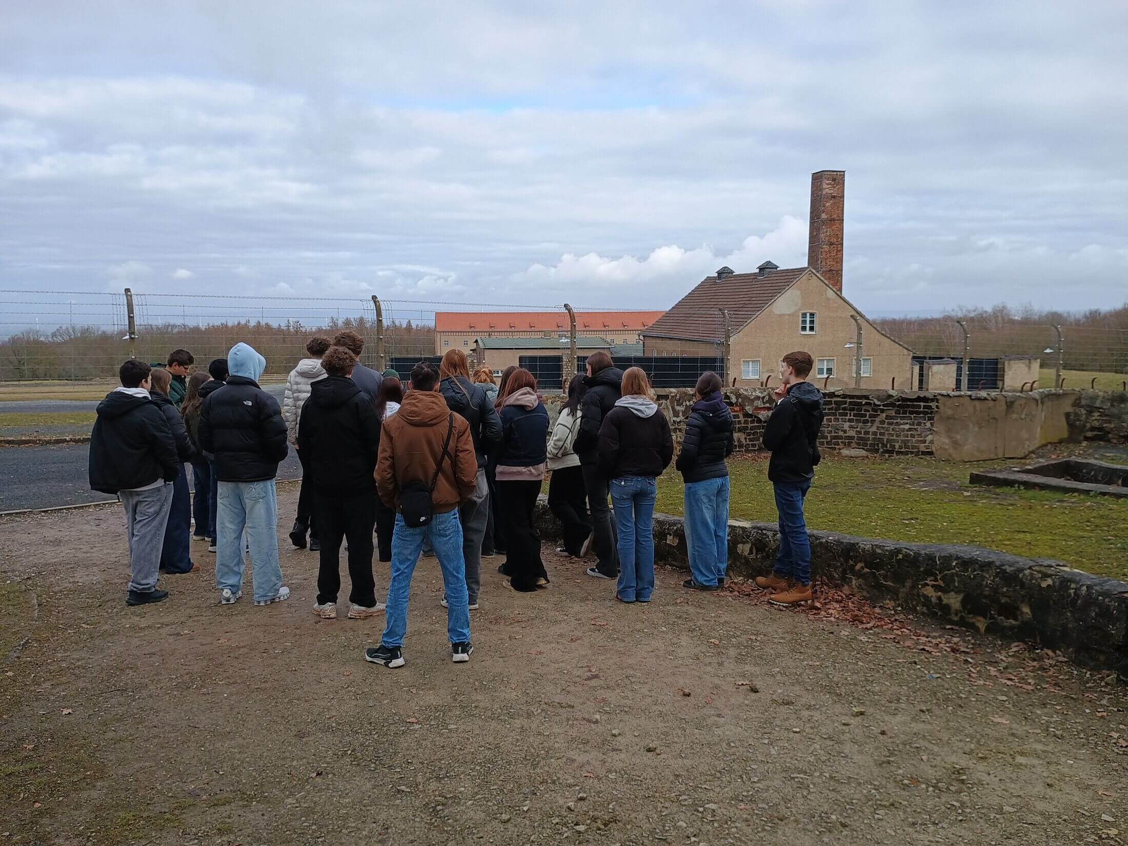 Vom 23.02. bis zum 27.02.2026 unternahm unser Projektkurs Buchenwald der Klasse 10. eine Kursfahrt zur Gedenkstätte Buchenwald bei Weimar. Am Montag, den 23.02 fuhren wir zunächst nach Weimar. Anschließend fuhren wir von dort mit einem Bus hoch zur Gedenkstätte Buchenwald. Schon auf der Busfahrt durch den Wald merkten wir, dass sich alles anders anfühlte; die Stimmung war bedrückend und angespannt. Als wir ankamen, wurde uns mehr über den Plan der Woche erklärt, und abends, als wir nach dem Abendessen noch einmal genauer in einem Sitzkreis über das Gelände informiert wurden, wurde uns erzählt, dass wir in dem Haus schliefen, in dem früher die SS-Aufseher untergebracht waren. Dort bekamen wir einen ersten Eindruck über die grausamen Verbrechen, die hier geschehen sind.