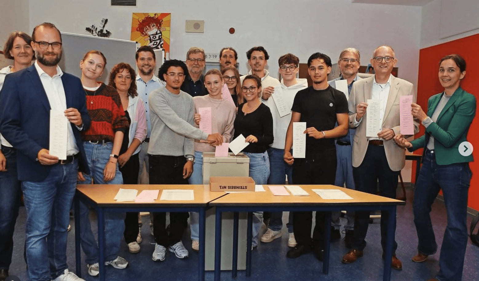 Zum Schluss wurde es richtig spannend: Mit einer originalen (!) Wahlurne aus dem Rathaus durften unsere Schülerinnen und Schüler selbst wählen: einmal für die Partei und einmal für die Oberbürgermeisterin oder den Oberbürgermeister.