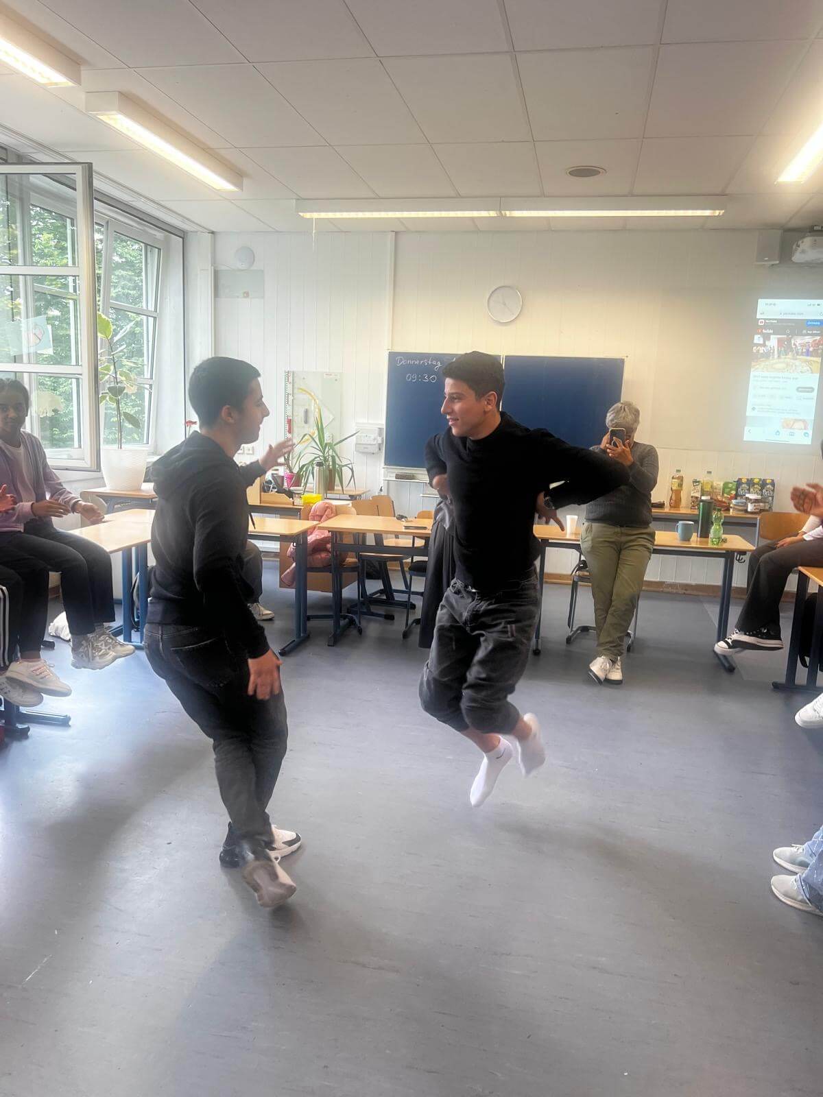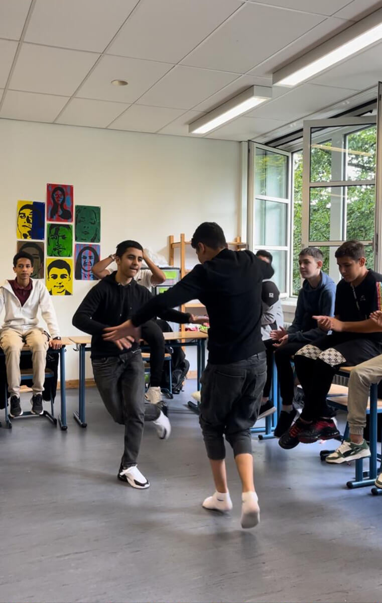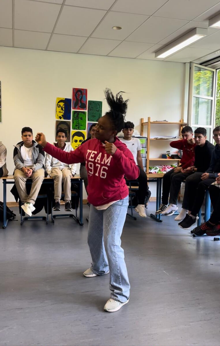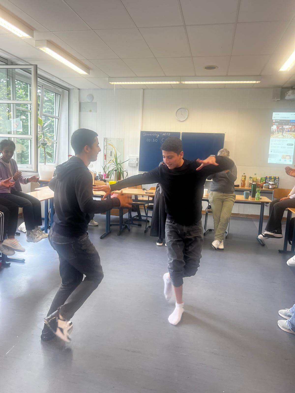Am Mittwoch fand ein Tanzworkshop statt, bei dem traditionelle Tänze vorgestellt wurden. Anfangs trauten sich viele Schülerinnen und Schüler eine aktive Teilnahme nicht zu. Aber um die Hemmschwelle zu überschreiten, spielten wir alle gemeinsam, auch wir Lehrerinnen, den Stopp-Tanz. Das machte allen sehr viel Spaß und half den Schülerinnen und Schülern sich zu öffnen. Danach stellten einige ihre Volkstänze und moderne Tanzarten (wie z. B. Breakdance) vor. Das schönste dabei war, dass alle dabei klatschten und sich zujubelten. Vor allem auch die Jugendlichen, die zunächst zurückhaltend waren und nicht so gern tanzen wollten.
