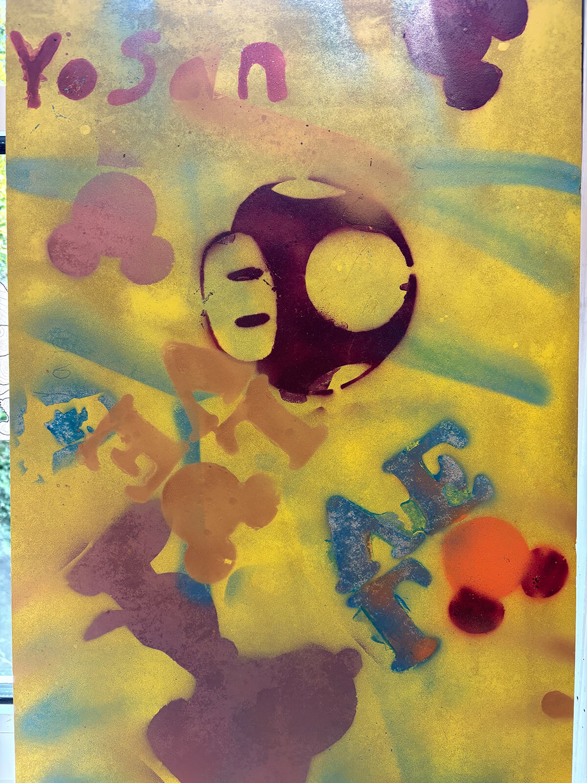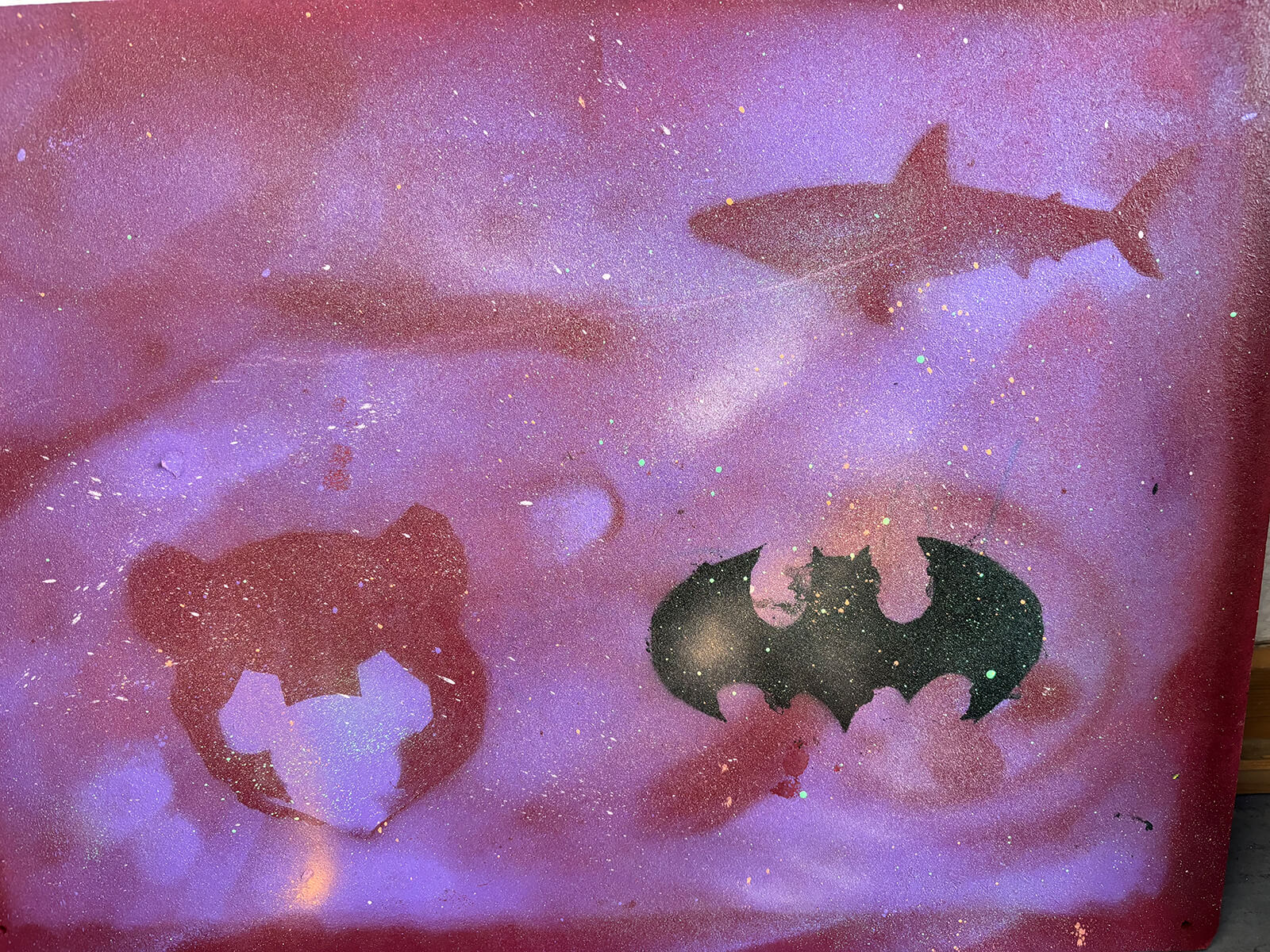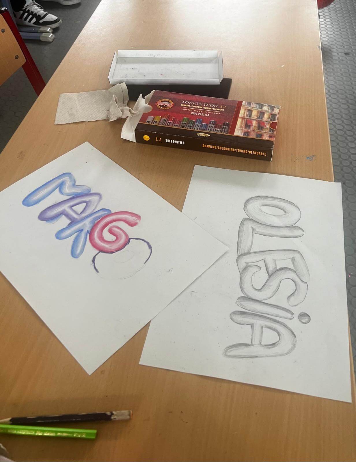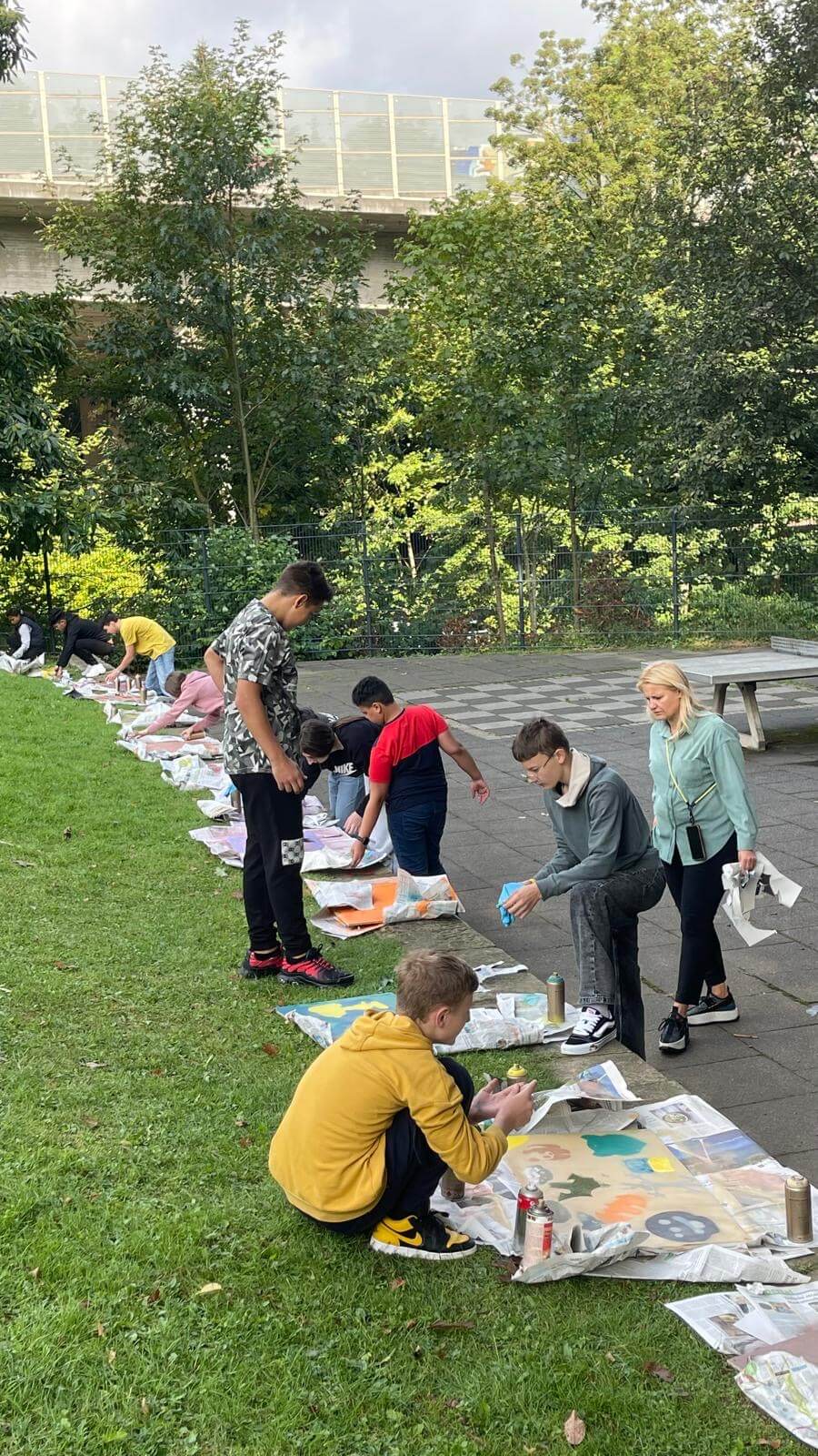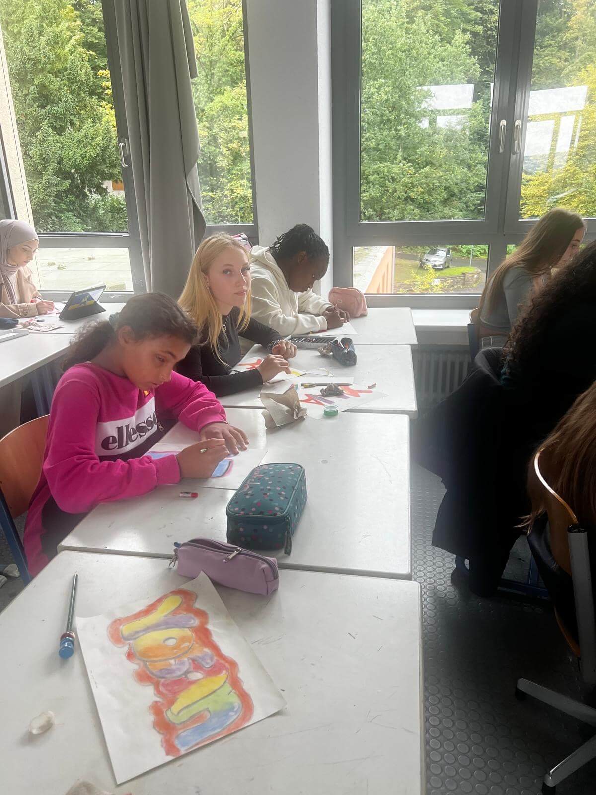 Um diese Ziele zu erreichen, boten wir unter der Leitung von Frau Weitz einen Graffiti-Workshop an. Die Schülerinnen und Schüler arbeiteten im Kunstraum und auf dem Schulhof. Die Teamlehrerinnen und Teamlehrer standen ihnen als Begleitung zur Hilfe, wenn es erforderlich war. Alle erstellten ihre eigenen Skizzen und Schablonen, schnitten diese aus und entwarfen eine Vorlage. Am nächsten Tag konnten sie dann ihre Entwürfe großflächig auf die Leinwände übertragen. Hierzu gab es erst einige Sprühübungen. Zusätzlich lernten die Schülerinnen und Schüler neue künstlerische Begriffe kennen.